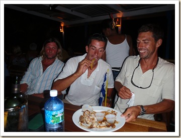 Plus nous nous rapprochions de Grenade et plus les équipages Québécois se faisaient nombreux. L’occasion était donc bien propice à une rencontre. Pourquoi pas à la ST-JEAN? Où? À Grenade puisque tous sont rendus ou presque en ce début de saison cyclonique. Pourquoi pas à la marina Whisper Cove à Grenade, laquelle appartient à un couple québécois. Tiens, ça commence à prendre forme. Ghislain a donc pris contact avec Marie-France et Gilles, propriétaires de la marina, lesquels se sont montrés tout de suite emballés, chaleureux et très ouverts. Ils nous ont proposé un menu, comme s’ils savaient ce qui manquaient à nos papilles gustatives : poulet rôti à la St-Hubert et frites! D’ailleurs, nous sommes toujours en manque de frites; dès que nous avons la chance d’en manger, nous en mangeons! Pourtant, au Québec, nous n’étions pas de grands consommateurs de frites; peut-être cette saveur locale a un p’tit quelque chose de réconfortant!!!